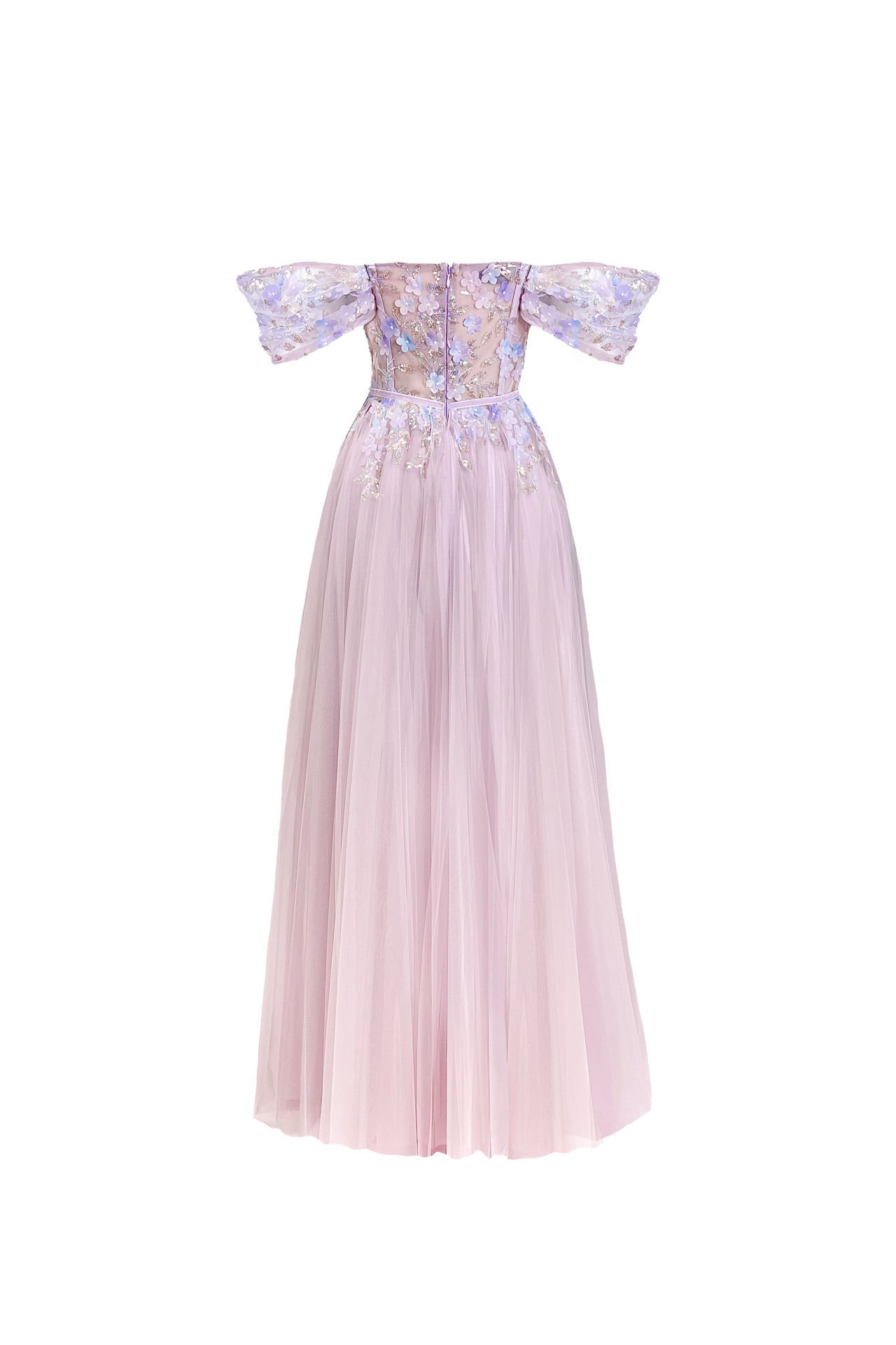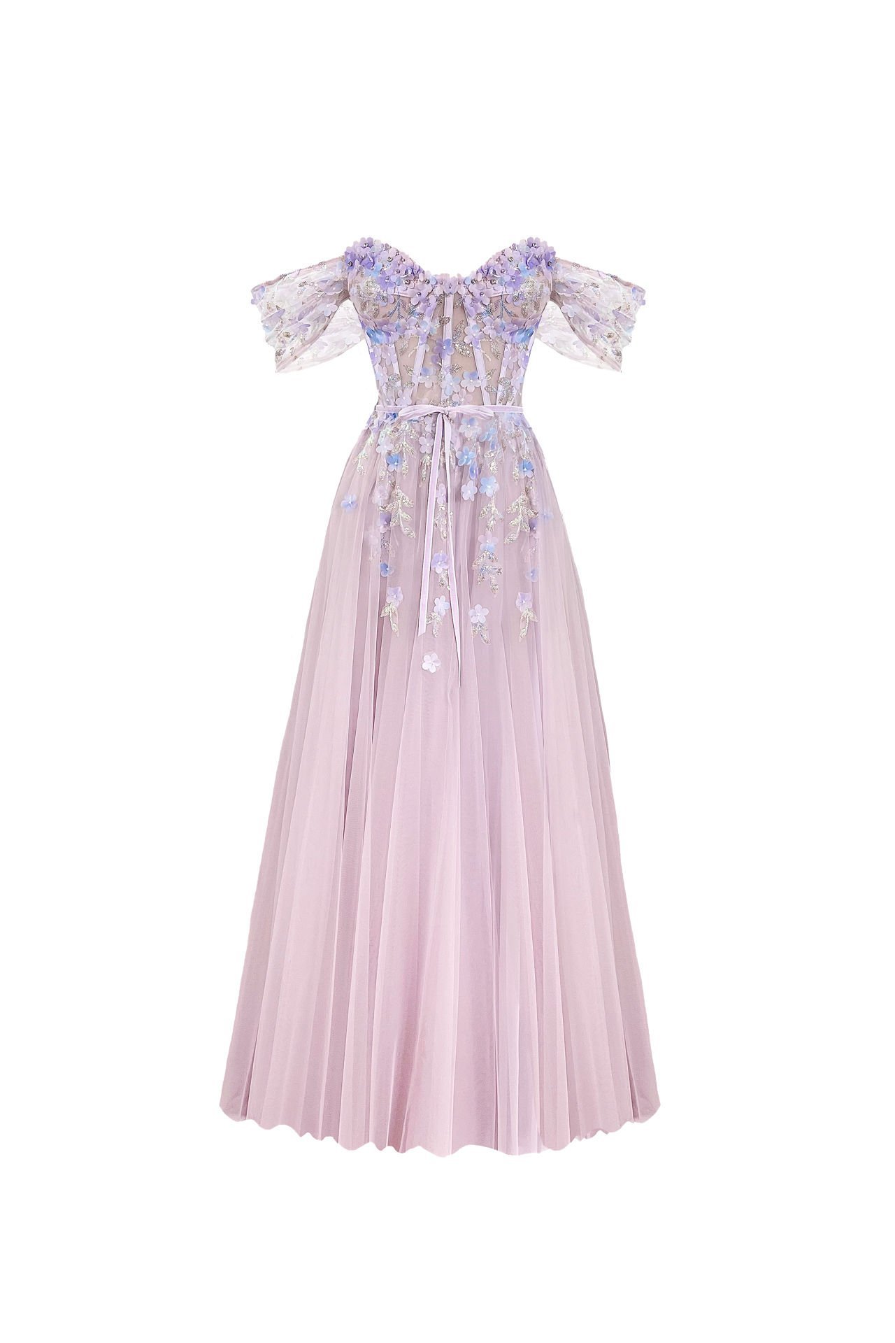"Hayalperestler için tasarlanmış, lila rengi tül elbisemizdeki zarif çiçek ve swarovski taş detaylarıyla göz kamaştırın ve her adımda büyüleyici bir görünüm yakalayın!"