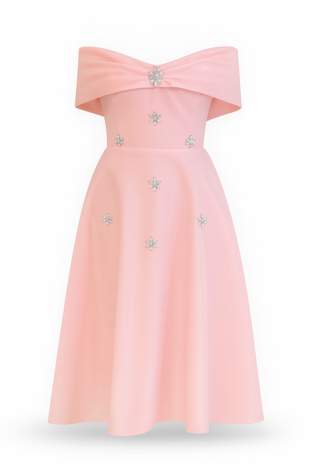 Omuzlarını en güzel şekilde vurgulayan kayık yaka detayıyla, çok zarif!