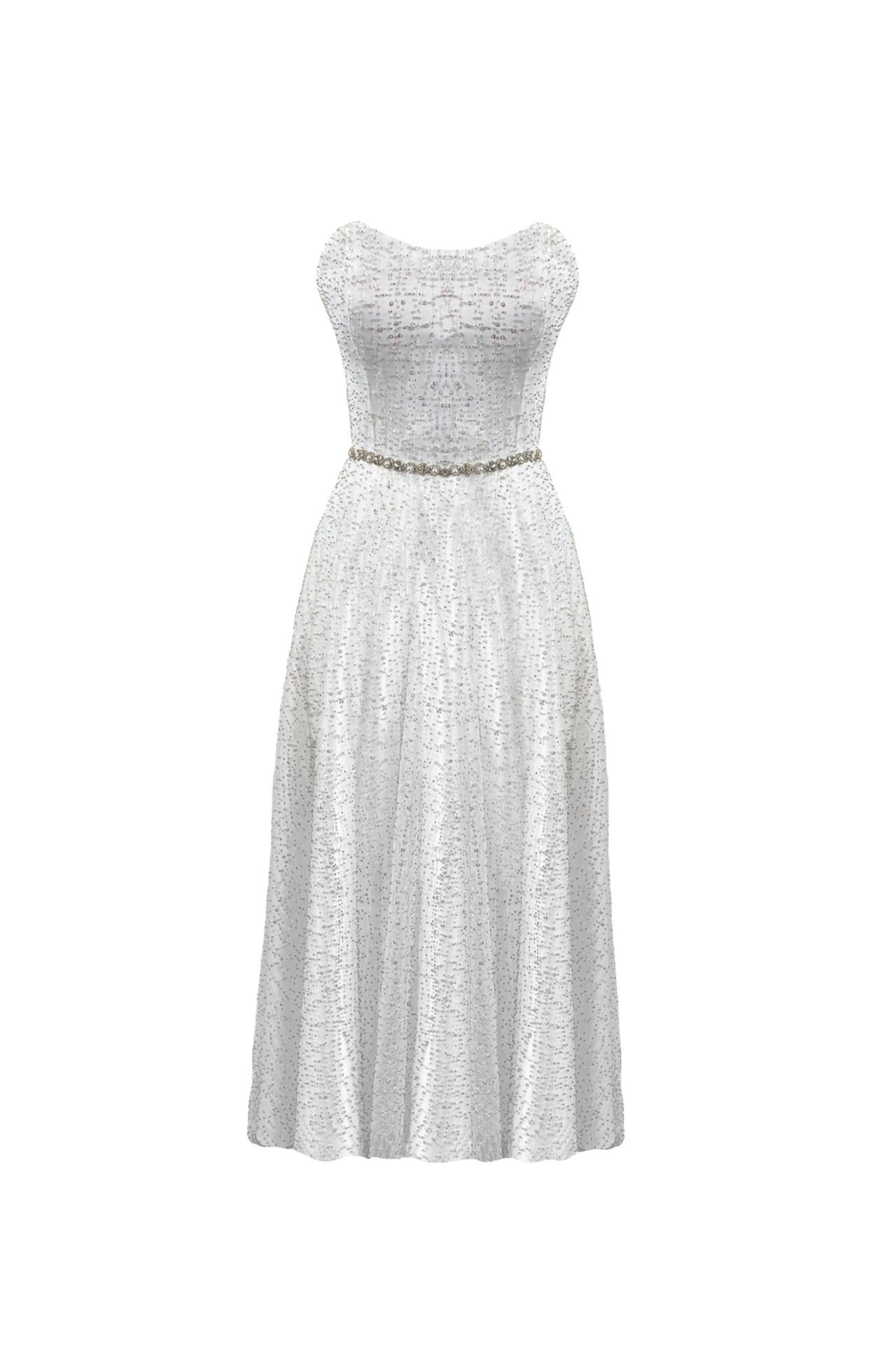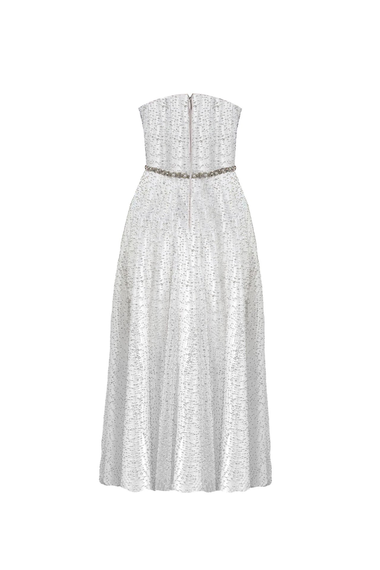 "Göz alıcı taşlarla süslenmiş, ışıl ışıl parlayan bu midi boy straplez elbise, her adımda zarafetinizi ve şıklığınızı ön plana çıkaracak. Kendinizi özel hissetmek için mükemmel seçim!"